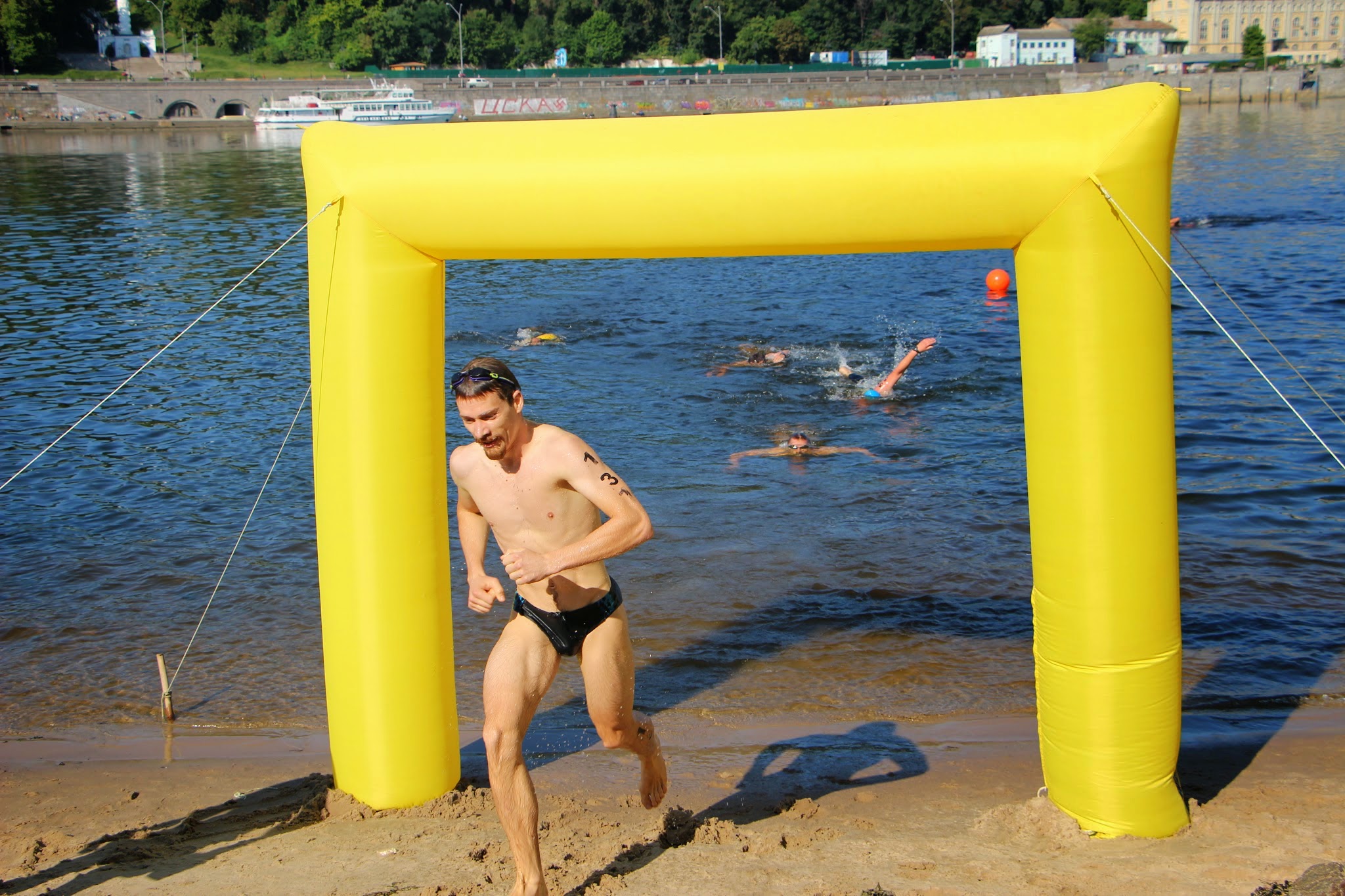 Все время чередую брас-кроль. Болят руки – перехожу на брас, болят ноги – перехожу на кроль. Руки не жалко, они только для плаванья. Ноги берегу на велоэтап. Где ж еще я могу отжечь. По честному оплываю все буйки, хоть в конце и был соблазн за компанию срезать мимо красных буев. «Разом и батька легше бити», но мы ж тут решили «жити по-новому», да и боялся штраф схватить.