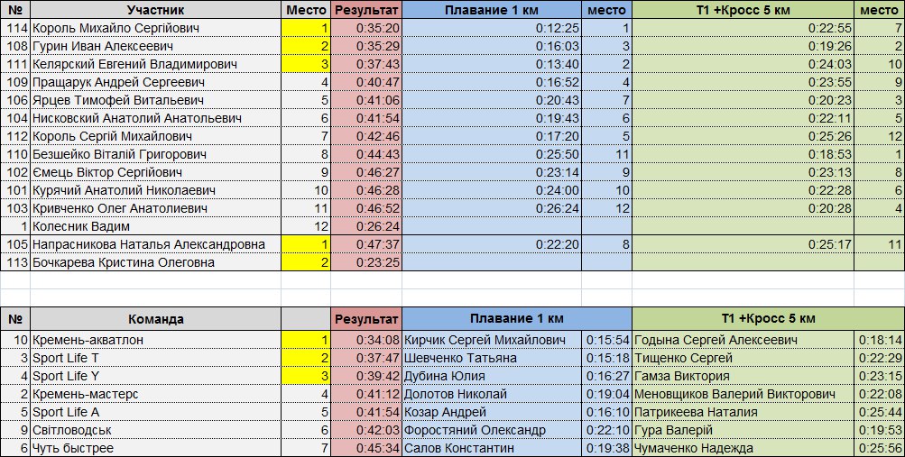 Щодо естафетних команд, то тут підсумкова розстановка сил після плавання дещо змінилася. Після того, як Сергій Кірчик з результатом 15,54 другим передав чергу Сергію Годині, - останній з найшвидшим біговим темпом наздогнав Сергія Тищенко ("Sport Life T") і фінішував з кращим часом в абсолюті - 34 хвилини 8 секунд. То ж золото залишилось в оргкоманді "Кремень-акватлон", срібло взяли Тетяна Шевченко і Сергій Тищенко (37,47), а бронзу жіноча команда "Sport Life Y" (Юлія Дубина та Вікторія Гамза 39,42).